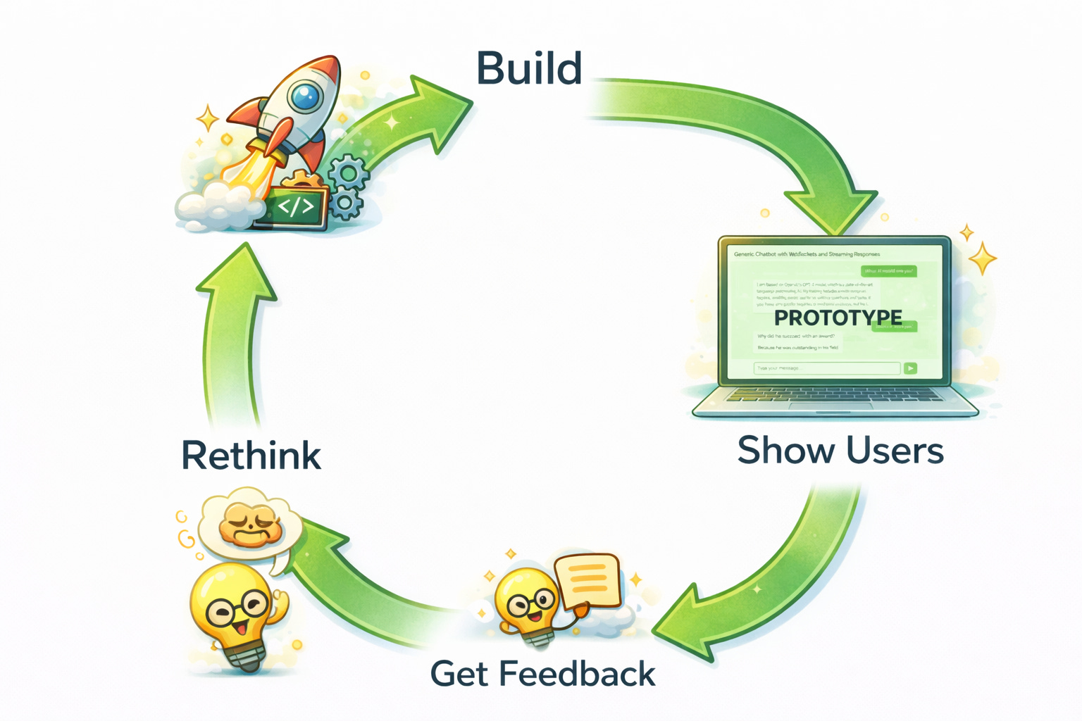 Rapid closed-loop iteration: Build → Test with users → Learn → Pivot. All in days, not months. AI handles the heavy coding lift; they handle the judgment.